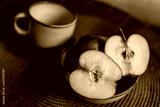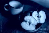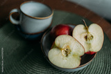 Two red ripe apples on a green napkin. The apple is cut in half. Two halves of an apple. One apple is whole and lies in a plate