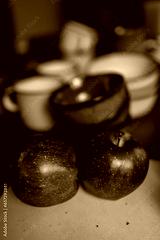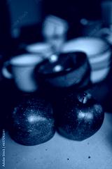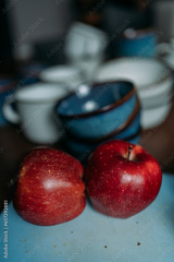 Two red ripe apples on a blue chopping board. There are grey and blue dishes in the background. A set of dishes for lunch. Dinner set for the whole family