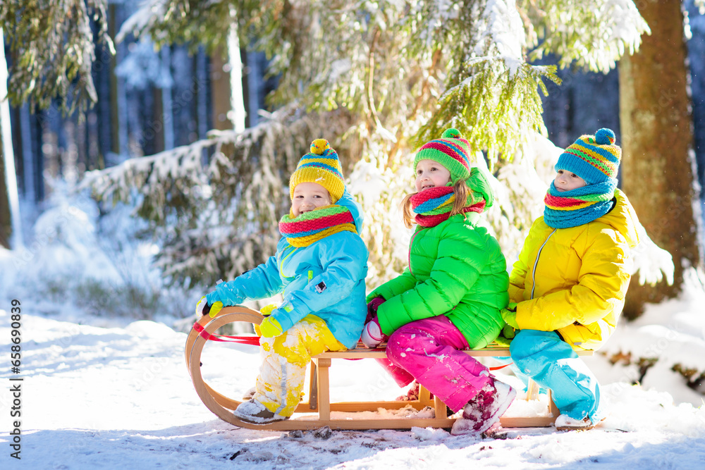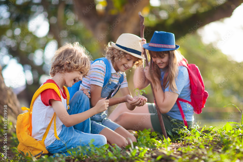 Kids explore nature. Children hike in sunny park.