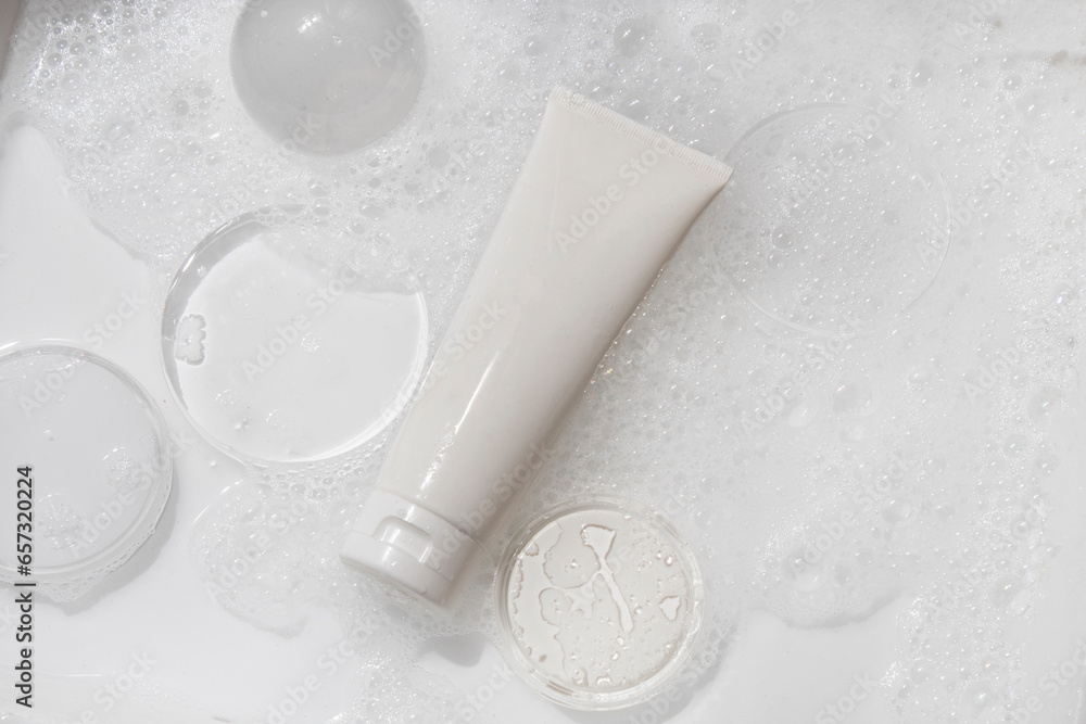 makeup cosmetic medical skin care, a mockup for cream lotion bottle product, packaging on white waterdrop fresh with glass background