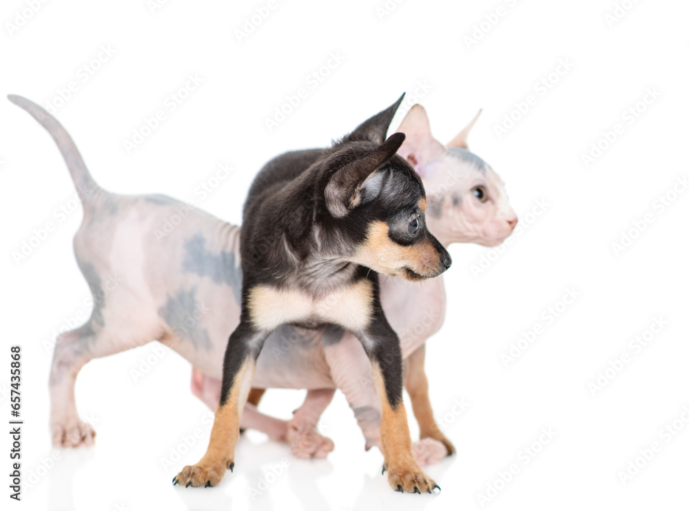 Toy terrier puppy and sphynx kitten stand together and look away on empty space. isolated on white background