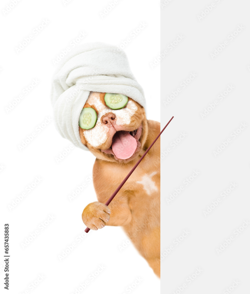 Happy Mastiff puppy with towel on his head and with cream on his face looks from behind empty white banner and points on empty space. isolated on white background