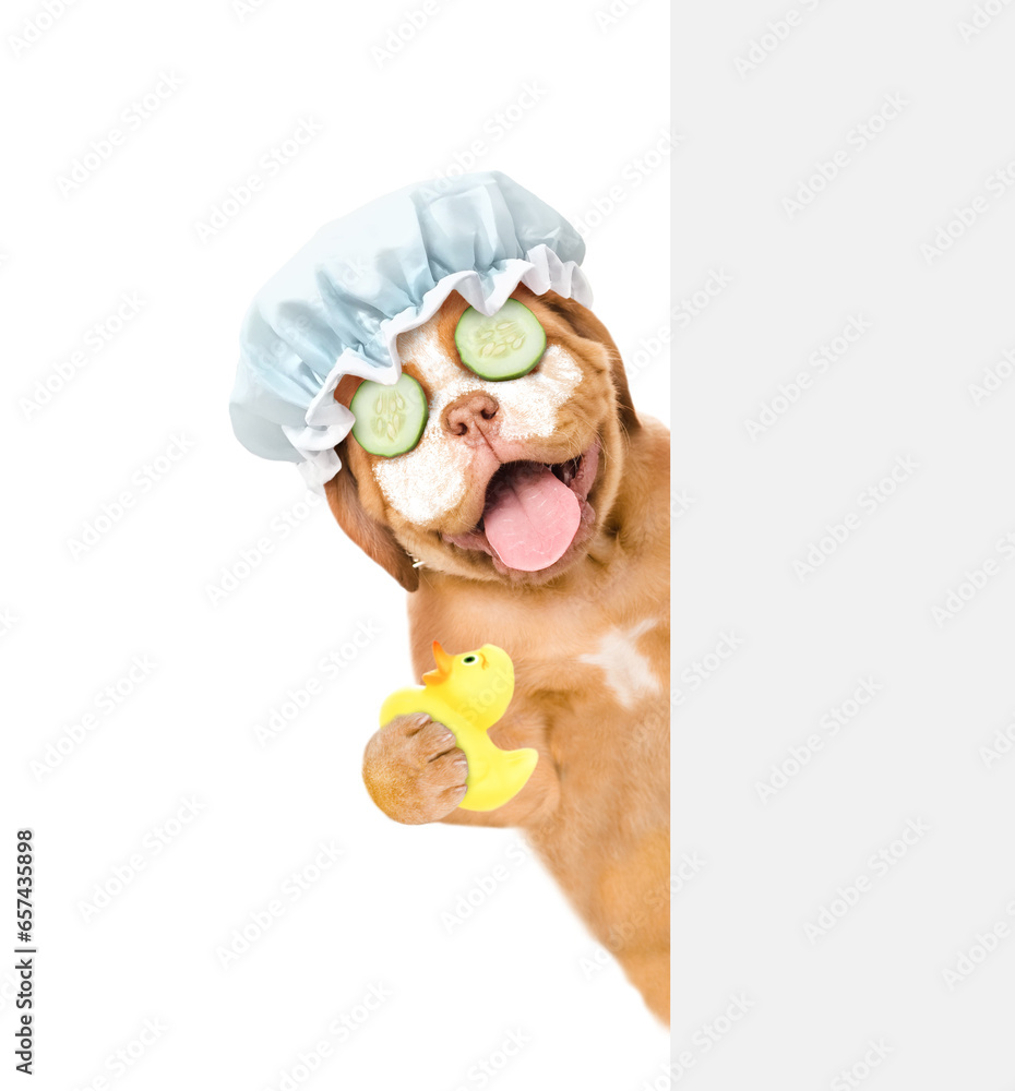 Happy Mastiff puppy with towel on his head and with cream on his face looks from behind empty white banner and shows rubber duck. isolated on white background