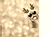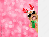 Happy Mastiff puppy dressed like santa claus reindeer Rudolf looking from behind empty white banner and holds gift box