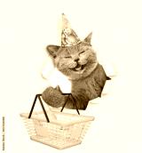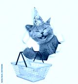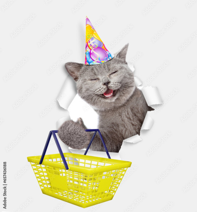 Happy cat wearing party cap looks through a hole in white paper and holds shopping basket