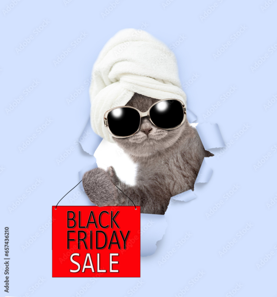 Cute kitten wearing sunglasses with towel on it head looking through a hole in blue paper and showing signboard with labeled "black friday sale"