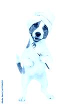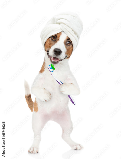 Jack russell terrier puppy with towel on it head holds toothbrush with toothpaste. isolated on white background