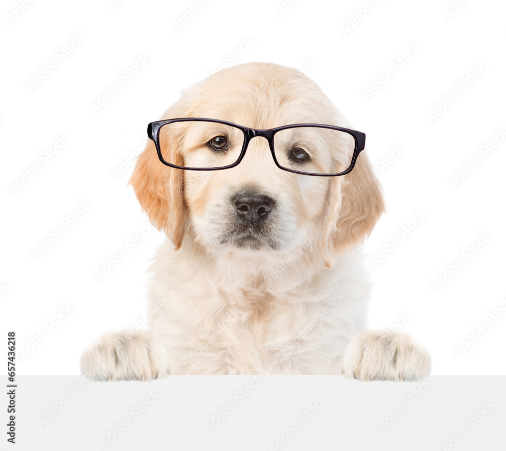 Smart Golden retriver puppy wearing eyeglasses looks above empty white banner. isolated on white background. Empty space for text