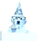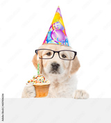 Smart Golden retriever puppy wearing funny eyeglasses and party cap looks above empty white banner and shows cupcake with burning candle. isolated on white background