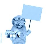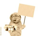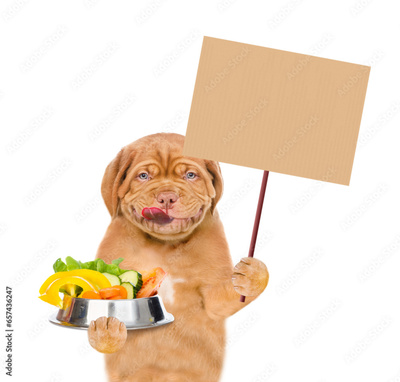 Happy Licking lips puppy holds bowl of vegetables and shows empty placard. Isolated on white background