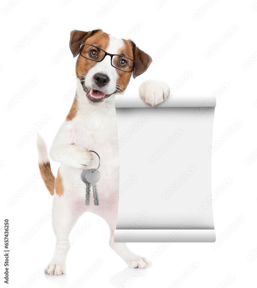 Smart Jack russell terrier puppy wearing eyeglasses holds in his paw the keys to a new apartment and shows empty list. Isolated on white background