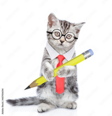 Smart kitten wearing eyeglasses and necktie standing on hind legs, and holding the pen. isolated on white background