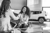 Happy woman buying a car and closing the deal with a handshake with the saleswoman at the dealership. Smiling car saleswoman discussing a contract with a female customer.
