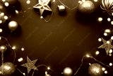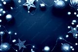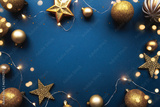 Christmas frame border with golden balls, stars, ribbon on blue background
