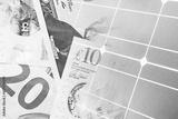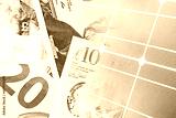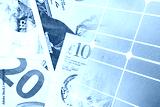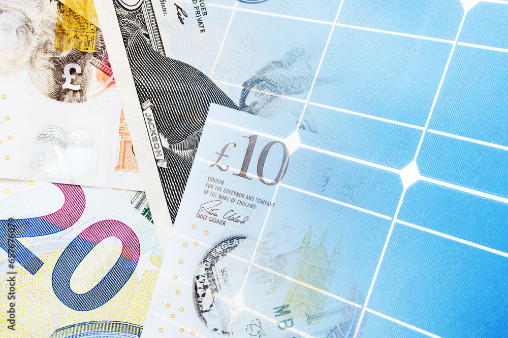 Solar panel texture. Environmental technology. Cco power supply background. Cell generating current. Renewable sources of energy. Photovoltaic panels pattern. Euro and pound bill electricity cost.