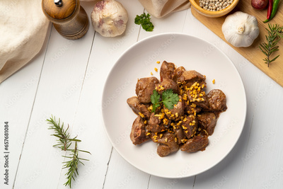 Fried chicken Liver with Garlic,Stir fry sliced liver with peppercorn and garlic in white plate.Top view