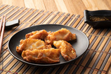 gyoza,Deep fried crispy dumplings in vegetable oil on black plate