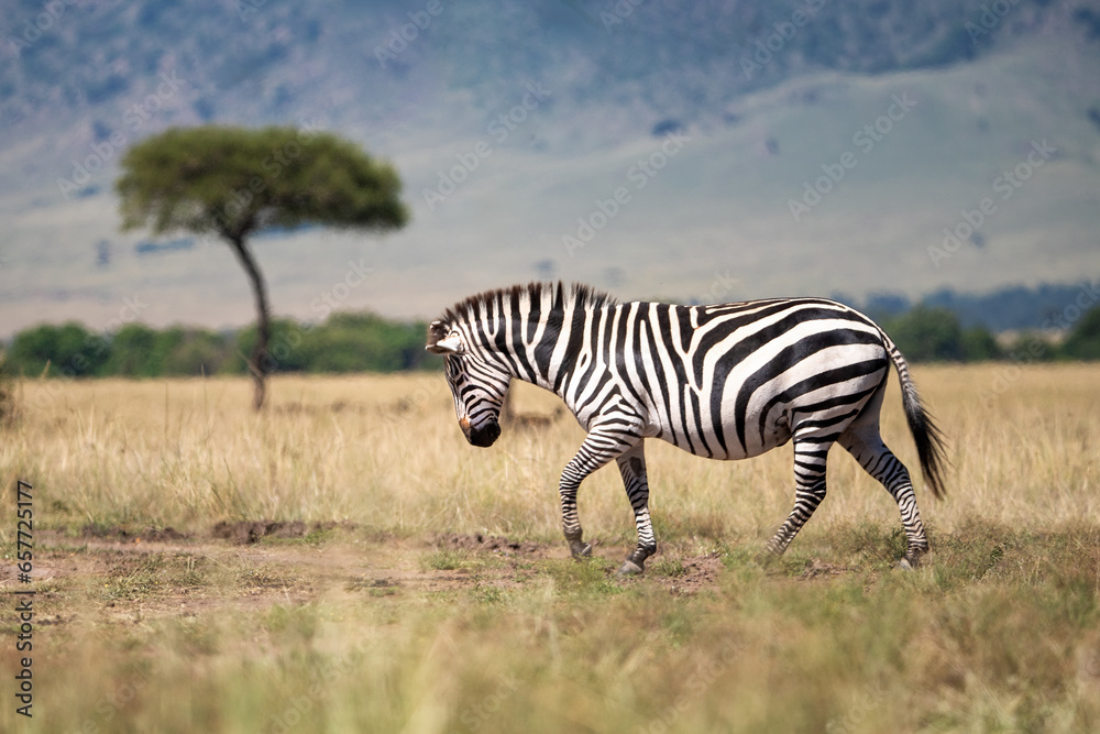 Common zebra, Equus Quagga, walking across the grasslands of the Masai Mara, Kenya. Side view with acacia trees and the Oloololo escarpment beyond..