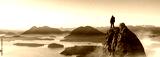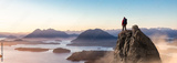 Adventure Man Hiker standing on top of Rocky Cliff. 3d Rendering Peak. Mountain Aerial Landscape Background from BC, Canada.
