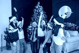 Group of happy children wearing Santa hats playing Christmas game. Merry Christmas