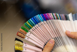 Collection of nails color polish samples. A palette of nail designs of different colors with gel polish. Transparent tips with nail polish samples. Demonstration fan-shaped palette of color shades.