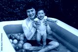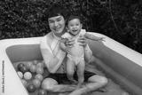 happy father and infant baby girl playing water with colorful plastic balls in inflatable pool