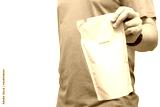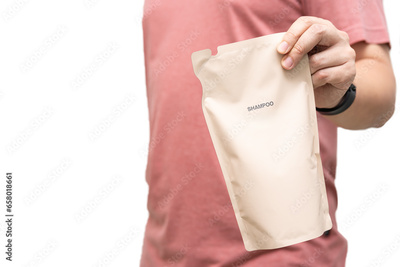 Man picking up shampoo plastic packaging for refill pouch isolated on white background. Zero waste. Reuse reduce recycle concept.