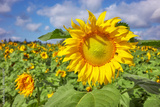Close up photo of a sunflower on a sunflower field, selective focus.