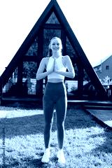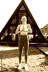 Vertical portrait of meditating yogini female putting hands in namaste mudra posture standing smiling looking at camera on lawn on background of country house. Pretty calm young woman practicing yoga.