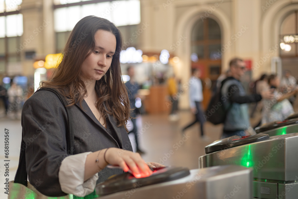 the passenger uses a transport card to pass through the turnstile. Transportation concept, scanning train ticket to subway entrance gate