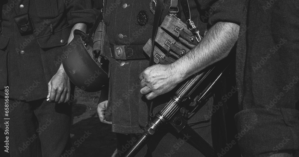 Re-enactor Dressed As German Wehrmacht Infantry Soldier In World War Ii With Submachine Gun Mp 40. German Soldier Uniform. German Soldier's Outfit.