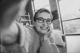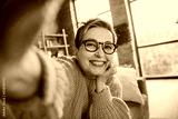 Photo of dreamy pretty elderly lady wear orange pullover spectacles arm hand cheek recording video indoors apartment room