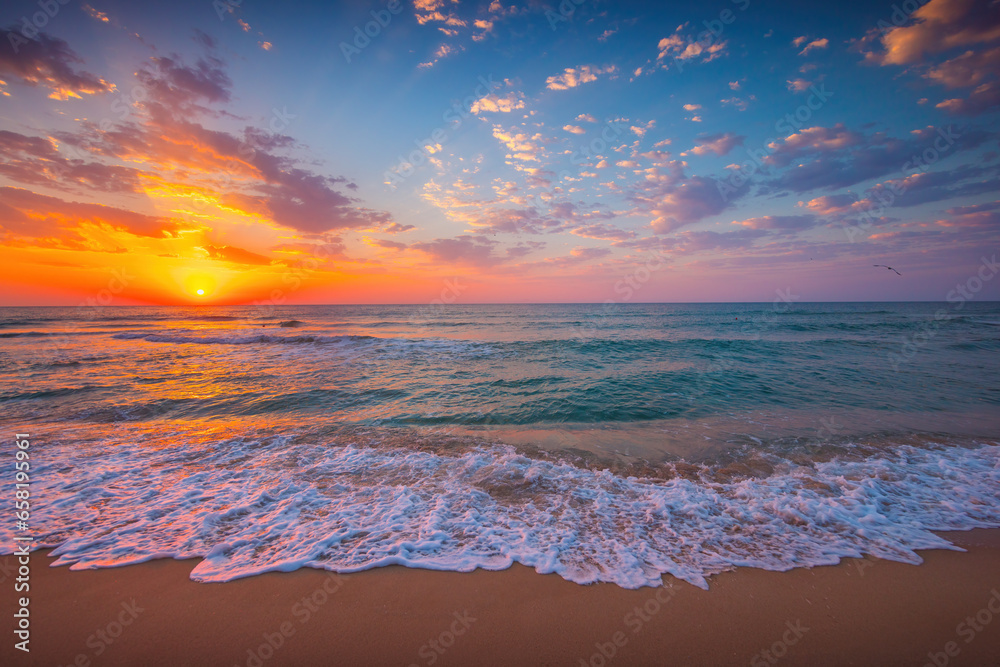 Tropical sunrise over ocean waves and beach shore, sea horizon nature landscape