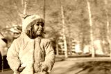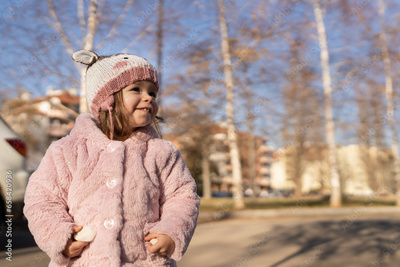 Small caucasian girl toddler stand in the city outdoor in winter day