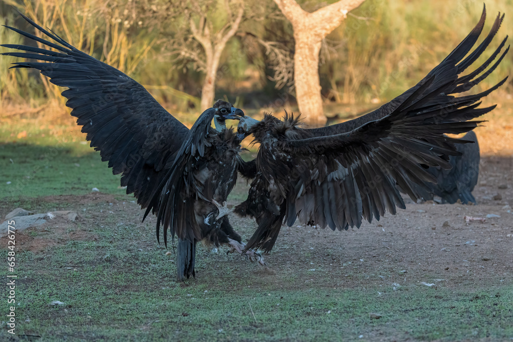 Two Black Vultures facing each other fighting.