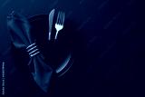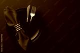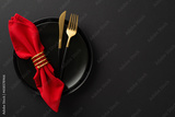 Black Friday grandeur: top view high-class table setting featuring fine dining essentials, dishes, cutlery, red napkin in gold ring on stylish black backdrop. Ideal for advertising your special deals