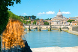 Panorama of Rome, girl tourist looks at St Peter's basilica, Italy