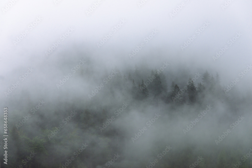 Amazing panoramic landscape mountain forests covering with a lot of fog after rain.