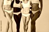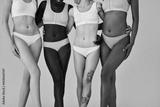 Young diverse women wearing different underwear standing on beige, close up beauty shot. Multicultural girls four models in tops panties hugging isolated on background. Body care and diversity concept