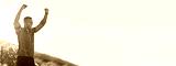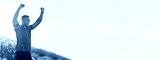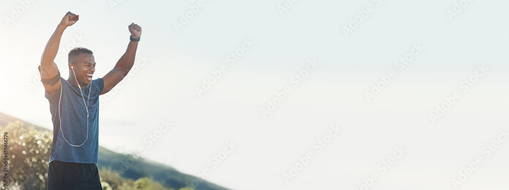 Happy man, fitness and fist pump in celebration on mockup for workout, exercise or outdoor training. Male person or athlete smile for achievement, winning or sports motivation on banner in success