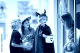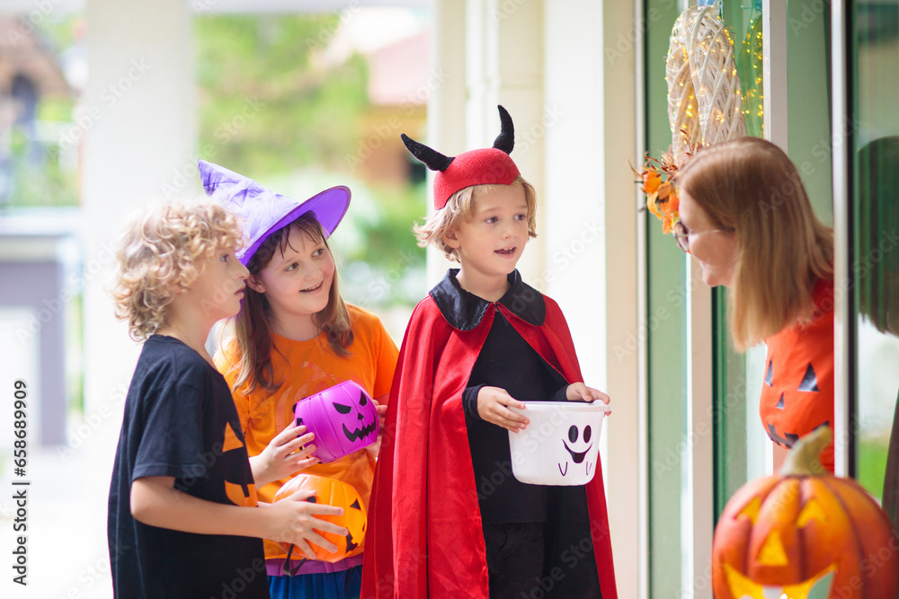 Kids trick or treat. Halloween. Child at door.