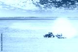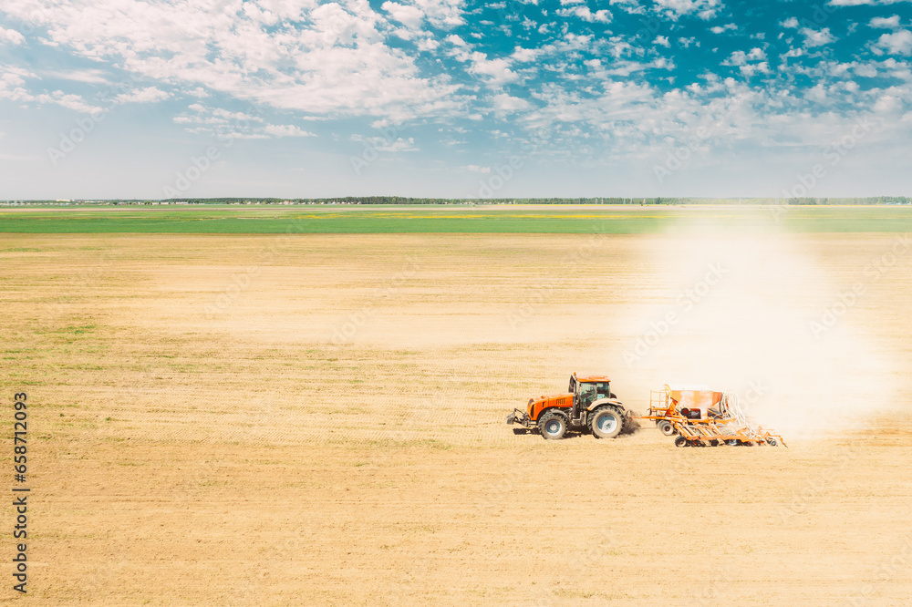 Elevated View Tractor With Seed Drill Machine Sowing Seeds For Crops In Spring Season. Beginning Of Agricultural Spring Season. Countryside Rural Field Landscape. Sunlight sunbeam sunshine,