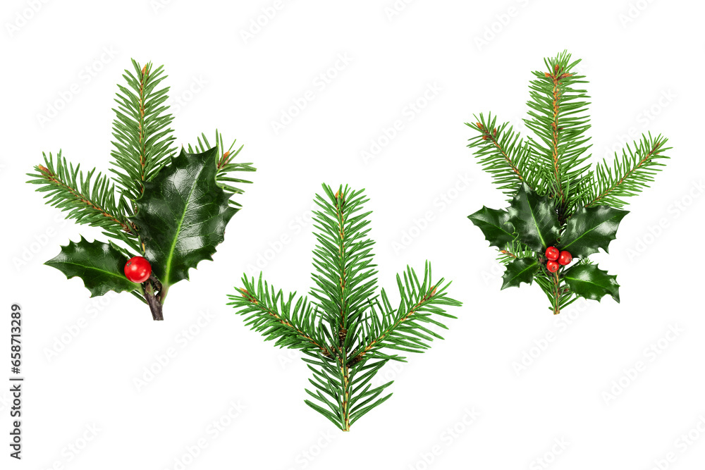 Collection of Fir tree and holly berries branch cut out on transparent background. Christmas tree and holly berries twig for design.