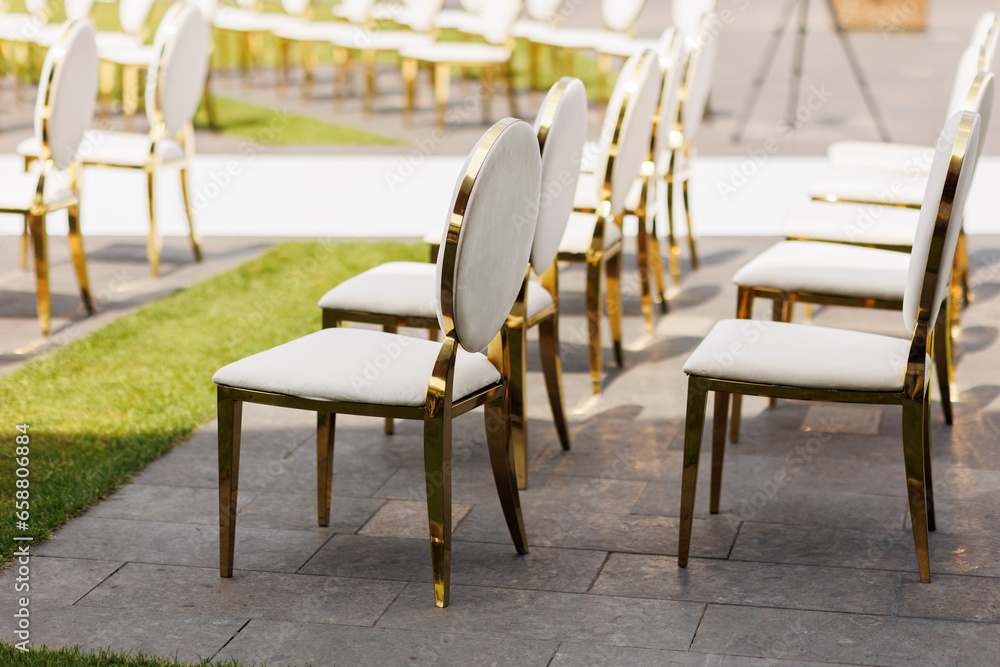 Luxury white-golden chairs on wedding ceremony outdoors. Festive decorations. Empty rows armchairs for guests. Outgoing wedding ceremony in the open air. Decor Studio.