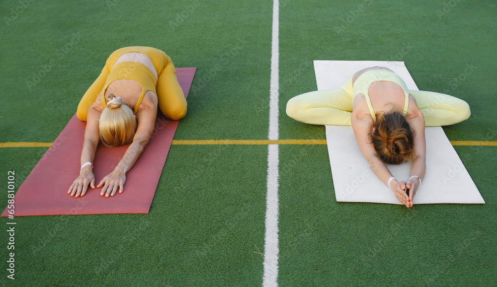 Two woman doing yoga outdoors Mother and adult daughter practicing together. Mature female and young girl having mindfulness activities. Family Active lifestyle, training in mountains
