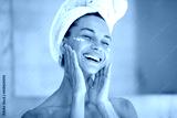 Overjoyed young woman in bathroom after shower apply nourishing moisturizing face cream or mask, smiling millennial female do morning daily beauty facial procedures in home bath, skincare concept