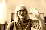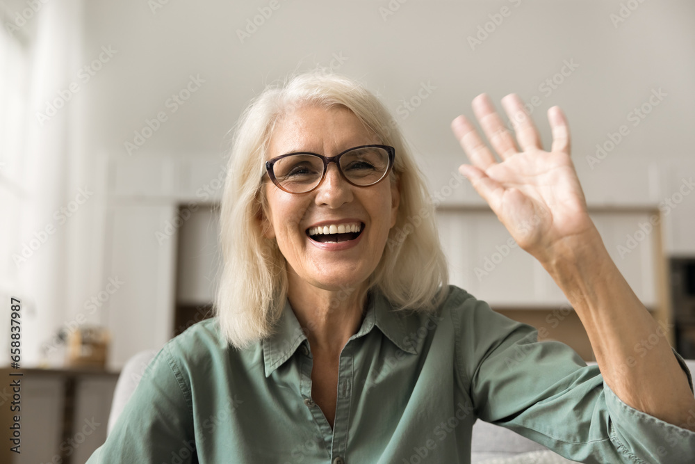 Cheerful beautiful blonde elder woman in stylish eyeglasses talking on online conference call, waving hi hand, saying hello, laughing, looking at camera with toothy smile. Head shot portrait