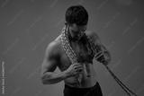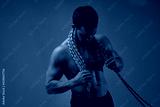 Handsome serious sporty strong guy bare-chested muscular sportsman isolated on blue background. Workout sport motivation lifestyle concept. Standing with battle ropes over neck, posing at camera