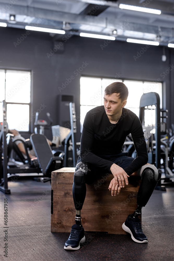young handsome brunette man in black sportswear has rest after hard workout, full length photo. rest. guy takes break