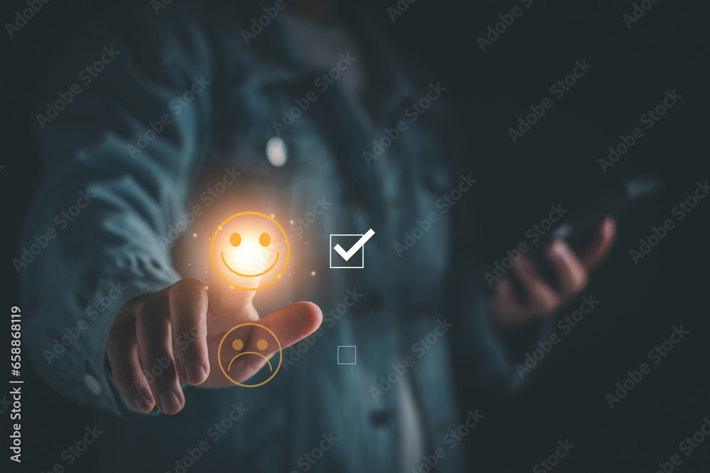 Customer service and Satisfaction ,business man giving Feedback satisfaction. five stars Positive Review. Client Satisfaction Surveys, good, five stars, best product and service. Excellence guarantee.